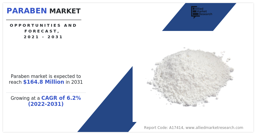WILMINGTON, DE, UNITED STATES, October 15, 2025 /EINPresswire.com/ -- According to the report published by Allied Market Research, the global Paraben market accrued revenue worth $91.1 million in 2021, and will reach $164.8 million by 2031, registering a CAGR of 6.2% from 2022 to 2031. The market research report offers a comprehensive analysis of oscillating industry trends, top segments, value chains, major investment business scenarios, regional landscape, and competitive space. The study is a major source of information for giant players, entrepreneurs, owners, and managers in creating new business plans for the future and taking steps to improve their market position. The report demonstrates an in-depth quantitative analysis of the market from 2022 to 2031 and guides investors in allocating funds to the rapidly evolving market.