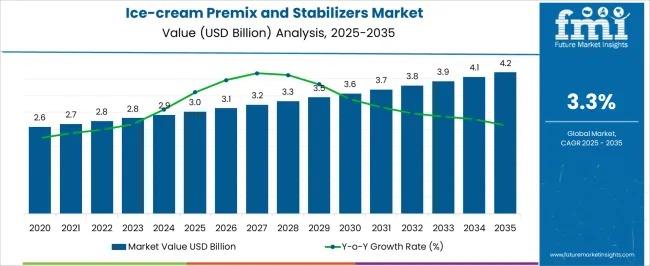 The market is projected to grow from USD 3.0 billion in 2025 to USD 4.2 billion by 2035, reflecting a CAGR of 3.3%. Early adoption from 2020 to 2024 saw manufacturers integrating premixes and stabilizers selectively, mainly in premium ice-cream lines. By 2025, broader adoption is expected as production capacity expands, supply chains are streamlined, and premixes become standard in more commercial and specialty products.